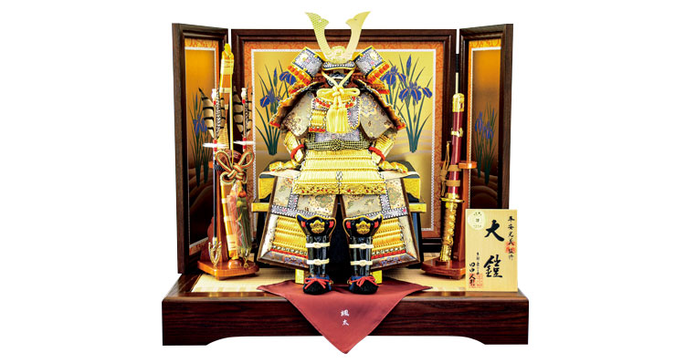 飾り台に屏風や弓太刀などをセットし、立派な出陣飾りの出来上がりです。